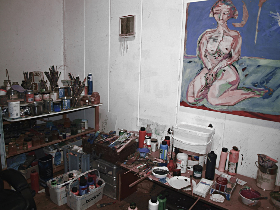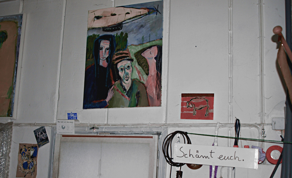 Als ich dort ankomme, werde ich zuerst einmal sehr freundlich begrüßt und mir wird ein Tee aus selbstgepflückter Waldminze angeboten. Das eigentliche Highlight ist aber der Raum, den Udo Großklaus seine Werkstatt und auch sein Zuhause nennt. Zumindest derzeit. Dass der Künstler hier sehr viel Zeit in seine Arbeit, in seine Bilder investiert, wird sofort klar, als ich die Menge an Gemälden sehe, die im ganzen Raum verteilt sind. An den Wänden hängend , auf dem Boden stehend und liegend. Besonders beeindruckt mich jedoch, dass der Maler hier tatsächlich lebt. Zugegebenermaßen erst einmal befremdlich für jemanden, der eine konventionelle Wohnsituation gewohnt ist. Doch nach genauerer Überlegung hat es doch etwas Leidenschaftliches, so nah mit seiner Arbeit, seiner Kunst und dringendsten Intention verbunden zu sein. Quasi Kopf an Kopf mit seinen Werken einzuschlafen.